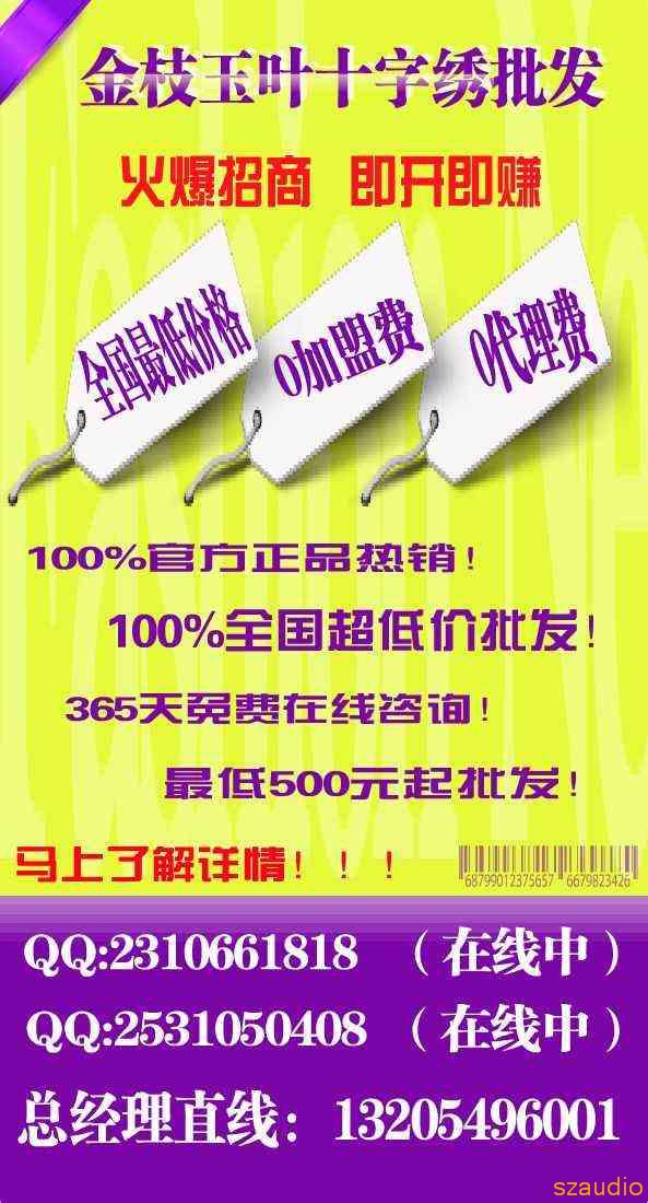 金枝玉叶十字绣批发零售,TEL:1347-5468-501 (全国客服)QQ:2531-0504-08加盟,100%官方正品,无加盟费,无代理费,一年10万等你拿!一个市场巨大的小本投资!一个利润丰厚的赚钱项目!一个挤破门槛的好生意,一年10万等你来拿!金枝玉叶十字绣批发火爆招商!◆没有技术,可以做!十字绣技术含量很低,一般2-3天就可上手。◆没有经验,可以做!总部提供365天在线咨询,确保你开店无忧。◆没有资金,可以做!总部不收你任何的加盟费、代理费和其他的管理费用。◆第一大优势:让你享受独家生意不是所有的十字绣品牌都是赚钱的,一些十字绣品牌投放市场已经很长时间了,几乎销售十字绣的店面都有,价格非常的透明,所以加剧了十字绣行业的竞争。也可以说老牌十字绣的牌子已经做烂了!!!如何才能在十字绣销售中具备得天独厚的优势呢?稳赚不赔,做独家生意呢?答案:就是寻找新的十字绣品牌!◆第二大优势:顾客认可,绝对赚钱金枝玉叶十字绣批发的十字绣品牌,都是刚刚上市的十字绣品牌,无论从包装、绣线方面等都比现有的十字绣品牌有很大的提升。且价格在同等质量的十字绣品牌中是最低的。所以,我们的十字绣品牌让你在销售的过程中享受得天独厚的优势,因为没有可比性,同时性价比要比同行十字绣要高,所以顾客非常认可,让你的利润更加的丰厚。◆第三大优势:快速回本,利润丰厚金枝玉叶十字绣批发的十字绣品牌,价格在同等质量的十字绣品牌中是最低的,即使你的十字绣买的比同行低,你的利润也会比同行要高。同时低于同行的价格让你在销售中顾客赢门,每天都享受收钱的快乐!◆第四大优势:小本投资,零风险金枝玉叶十字绣批发无任何的加盟费、代理费,同时总部为了把你的进货投资风险降到最低,首次进货建议你每个十字绣品种只进2-3件,先把店开起来,然后盈利后在陆续的进货,让你投资没有任何的风险。◆第五大优势:十字绣价格行业最低谈到十字绣价格方面,金枝玉叶十字绣批发在甄选十字绣品牌方面始终把十字绣质量放在第一位,在保证十字绣质量的前提下把价格做到同等质量最低。只有真正确保十字绣质量才能给我们广大的加盟店带来良好的信誉和源源不断的利润和回头客金枝玉叶十字绣批发零售,TEL:1347-5468-501(全国客服)QQ:2531-0504-08 加盟,100%官方正品,无加盟费,无代理费,一年10万等你拿!